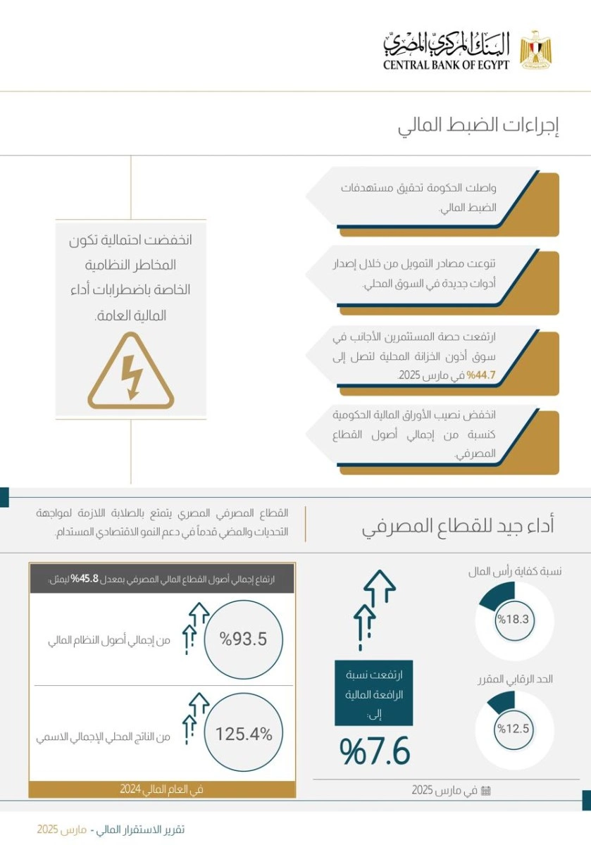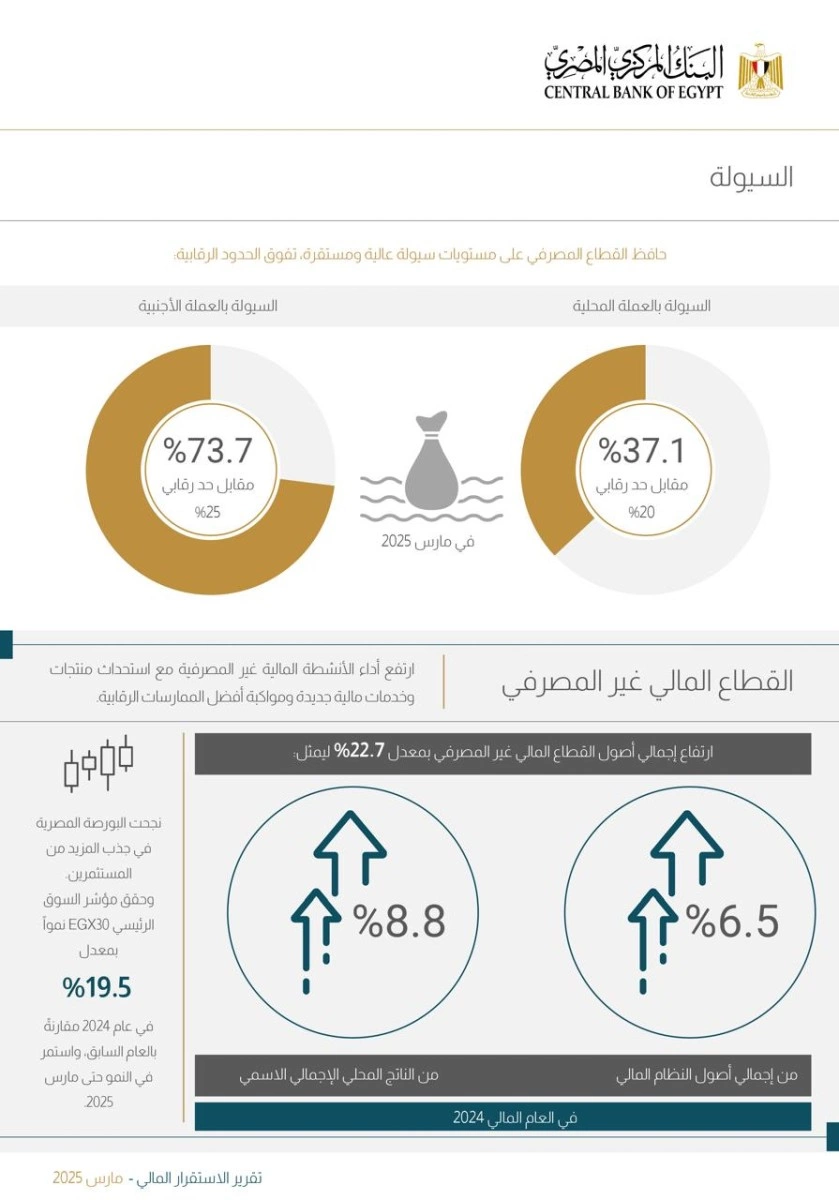 وأشاد التقرير بقدرة القطاع المصرفي على مواجهة وامتصاص العديد من الصدمات في الآونة الأخيرة واحتواء تداعياتها، وهو ما ساهم في استمرار ثقة المتعاملين معه، حيث سجلت الودائع نمواً بمعدل 25.3% في مارس 2025، معتمدة على الودائع المستقرة للقطاع العائلي. كما حقق اجمالي اصول القطاع المصرفي نمواً بمعدل 45.8%، ليُمثل 93.5٪ من إجمالي أصول النظام المالي و125.4% من الناتج المحلي الإجمالي الاسمي في العام المالي 2024.